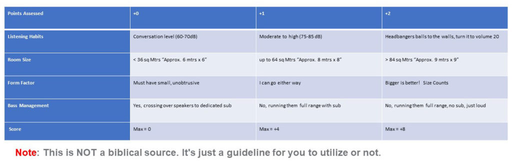 Just looking at these questions, one may come to the natural conclusion that it’s all about the bass. Well, they would be partially right but there are other considerations such as how loudly they can play. Below is a Scorecard, tabulated point system to help you decide.