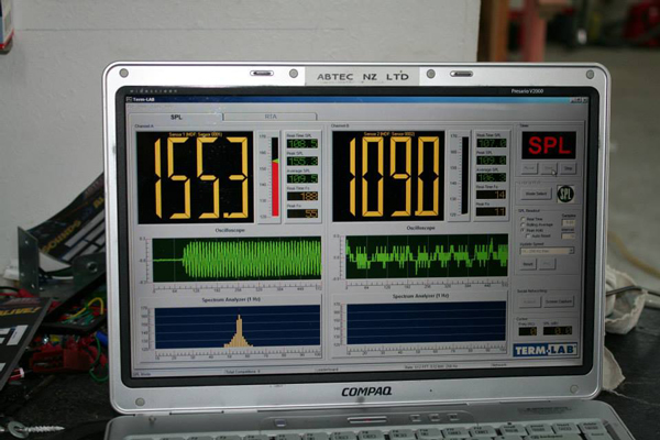 So on went the laptop, Term-Lab and SPL Sensor and now it was time for me to double/triple check everything to make sure I hadn’t missed a thing while setting up the Head-Unit/Car. So Ashley checks the meters one more time, I select 57Hz, pause, wind the volume up to 25, check with Ashley one more time and BURP…