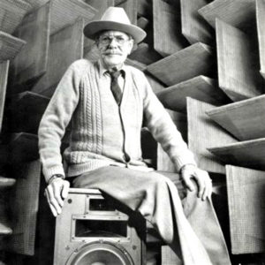 Paul Wilbur Klipsch sitting on the first speaker he designed, the Klipschorn, ancestor of the brand new Klipsch Forte III.