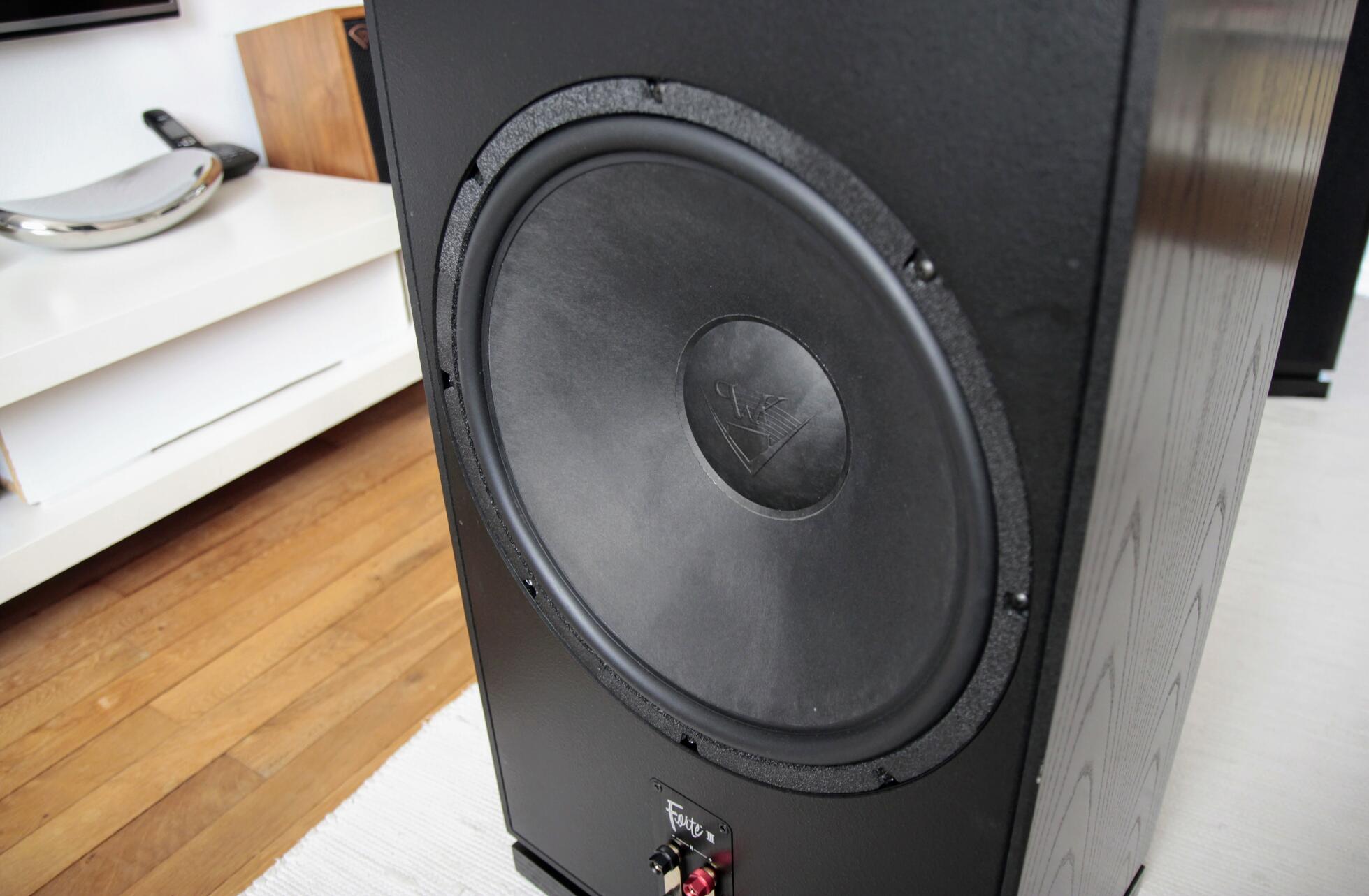 This is where issues usually arise. While the passive resonator allows the speaker to reproduce low frequencies using only a limited amount of air, its working principle implies an oftentimes mediocre transient response. The passive and active drivers are mechanically coupled by the air contained within the enclosure. As a result, the motor of the active driver has to set both its own cone and the resonator’s cone in motion, and lows have a tendency to drag due to the increased inertia. However, it’s important to put things into perspective. First of all, the Klipsch Forte III’s 12” active driver features a lightweight cone set in motion by a powerful motor. As for the passive driver, it is also equipped with a lightweight cone whose excursion is minimized thanks to its large diameter (15”). Klipsch made a sensible choice by tuning its speaker down to 38 Hz even though such a driver could easily reach 15 Hz (the cost being an appalling transient response).