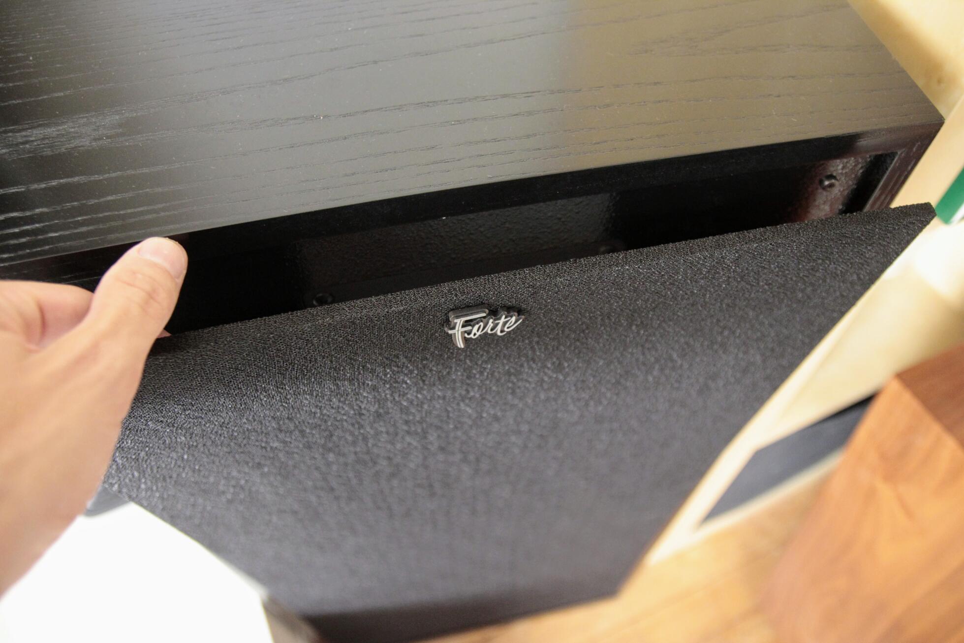 The Klipsch Forte III’s magnetic grill is composed of wood and cloth.