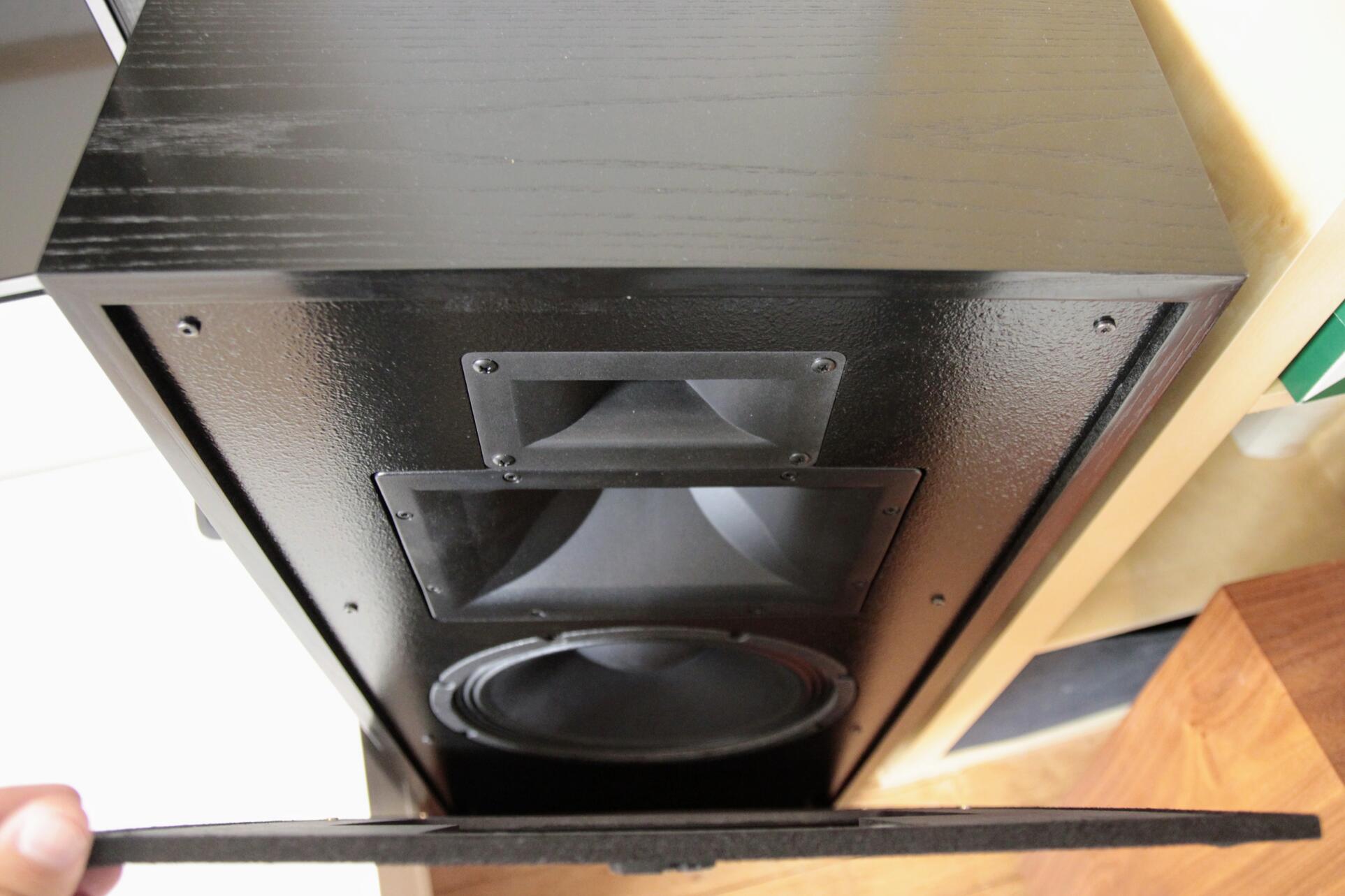 A 12” (30 cm) driver (similar to the one used for the Klipsch Heresy III) loaded in a closed enclosure and paired with a 15” (38 cm) driver is in charge of the lows. The mids are handled by a 1.75” (4.4 cm) titanium dome driver loaded in a newly designed horn, and the highs are covered by a horn-loaded 1” (2.5 cm) tweeter. Of course, all the drivers are manufactured by Klipsch in the United States.