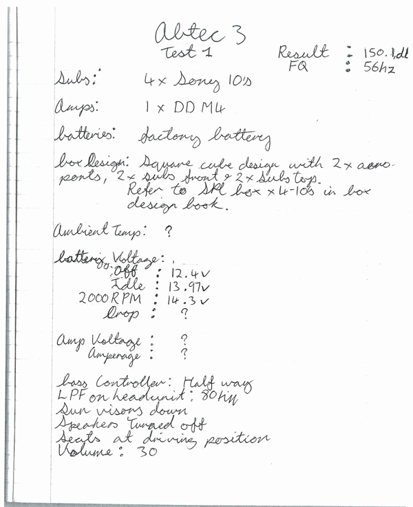 When it comes to testing it is important to have an accurate SPL Meter like a Termlab at hand so any changes made positive or negative can be noticed and noted down. If you don’t have use of a SPL Meter there will bound to be someone in the SPL scene willing to lend you theirs or willing to set their one up to help you test your gear.