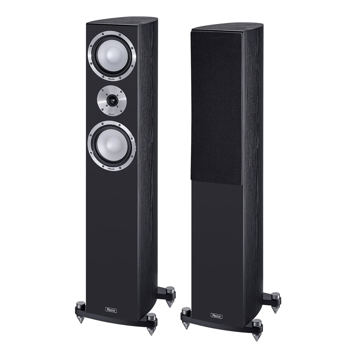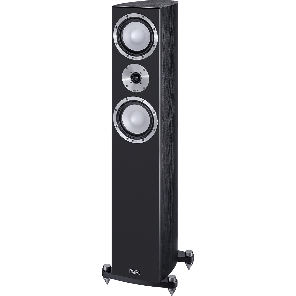 CABINET - Airflex port with rounded reflex opening to minimize annoying resonances, Baffle in semi-gloss lacquering, Solid and substantially braced MDF cabinet with rounded side panels and 25 mm low-resonance baffle, Detachable cloth grille with optimized acoustic transmissivity and hidden magnetic fixing, Solid cross beams made of painted MDF with height-adjustable massive metal cone spikes, Exchangeable metal/rubber spike tips for an optimum adaptation to the floor type