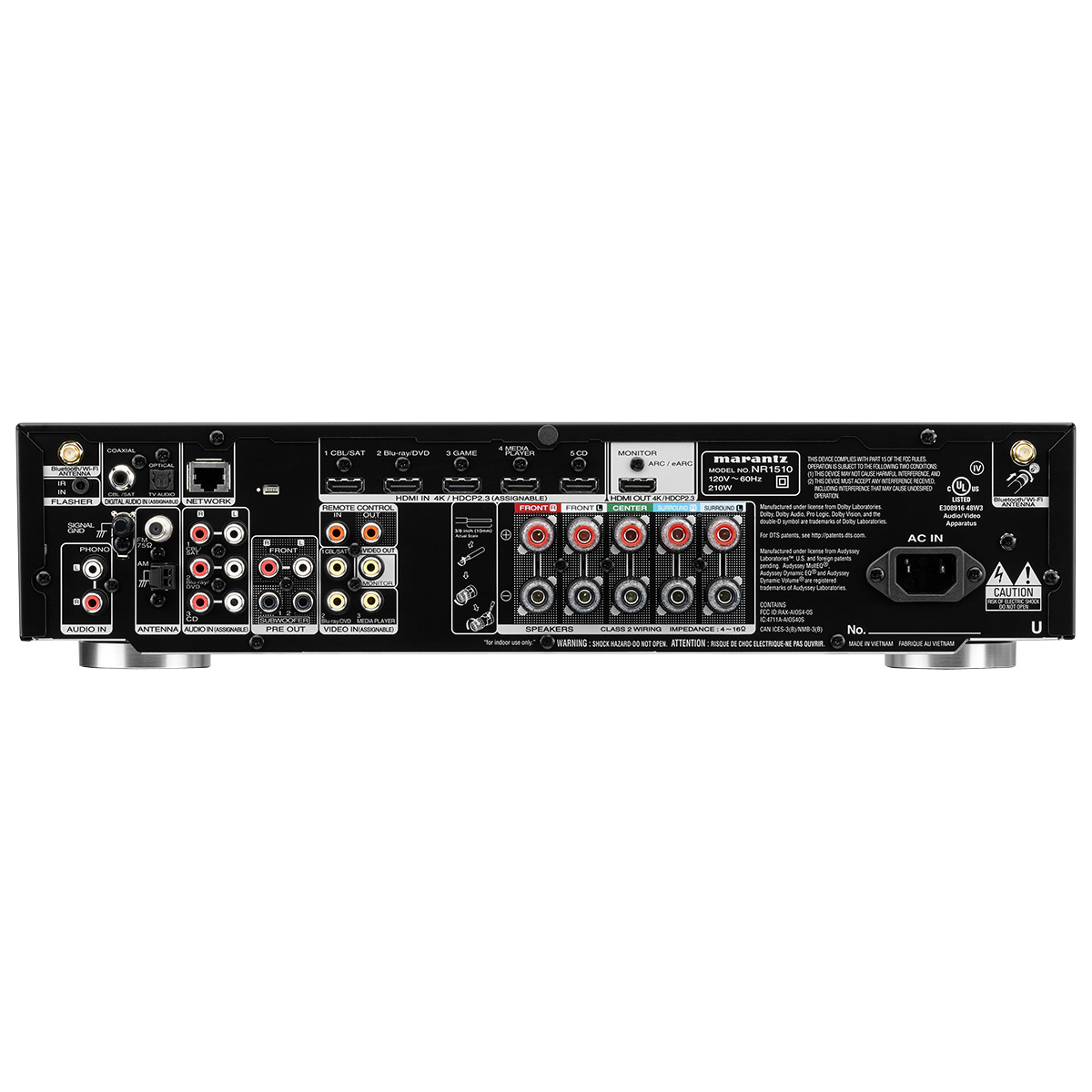 Experience exceptional audio performance from the slim profile Marantz NR1510 5.2ch 4K Ultra HD AV receiver that drives elevated surround sound and high-fidelity audio from a compact chassis. At half the height of a traditional AV receiver, the NR1510 features the latest in HDMI connectivity and delivers high-resolution surround sound from Dolby TrueHD and DTS-HD Master Audio. Six HDMI inputs — including one on the front panel — support the latest video and picture formatting and eARC transmission of enhanced audio. Stream music from popular online sources, and easily connect your analog turntable to the receiver to enjoy your vinyl collection. Control the NR1510 with voice control compatibility via Amazon Alexa, Google Assistant and Apple Siri.