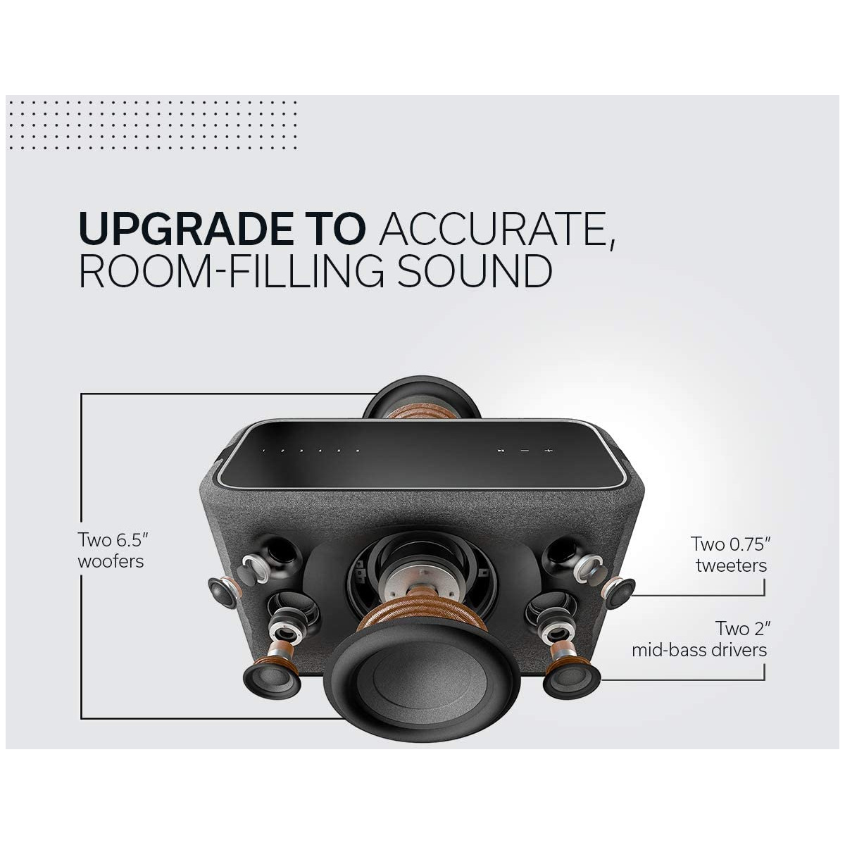 -stereo speaker with six built-in drivers (two 6-1/2" woofers, two 2" midrange drivers and two 3/4" tweeters), each powered by a separate Class D amplifier