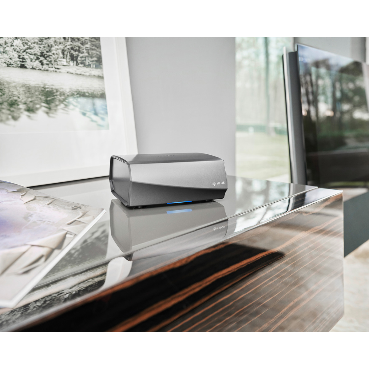 The elegant HEOS Link enclosure features stylish silver accents, and for convenience, there are volume and mute controls discreetly placed on the side panel.