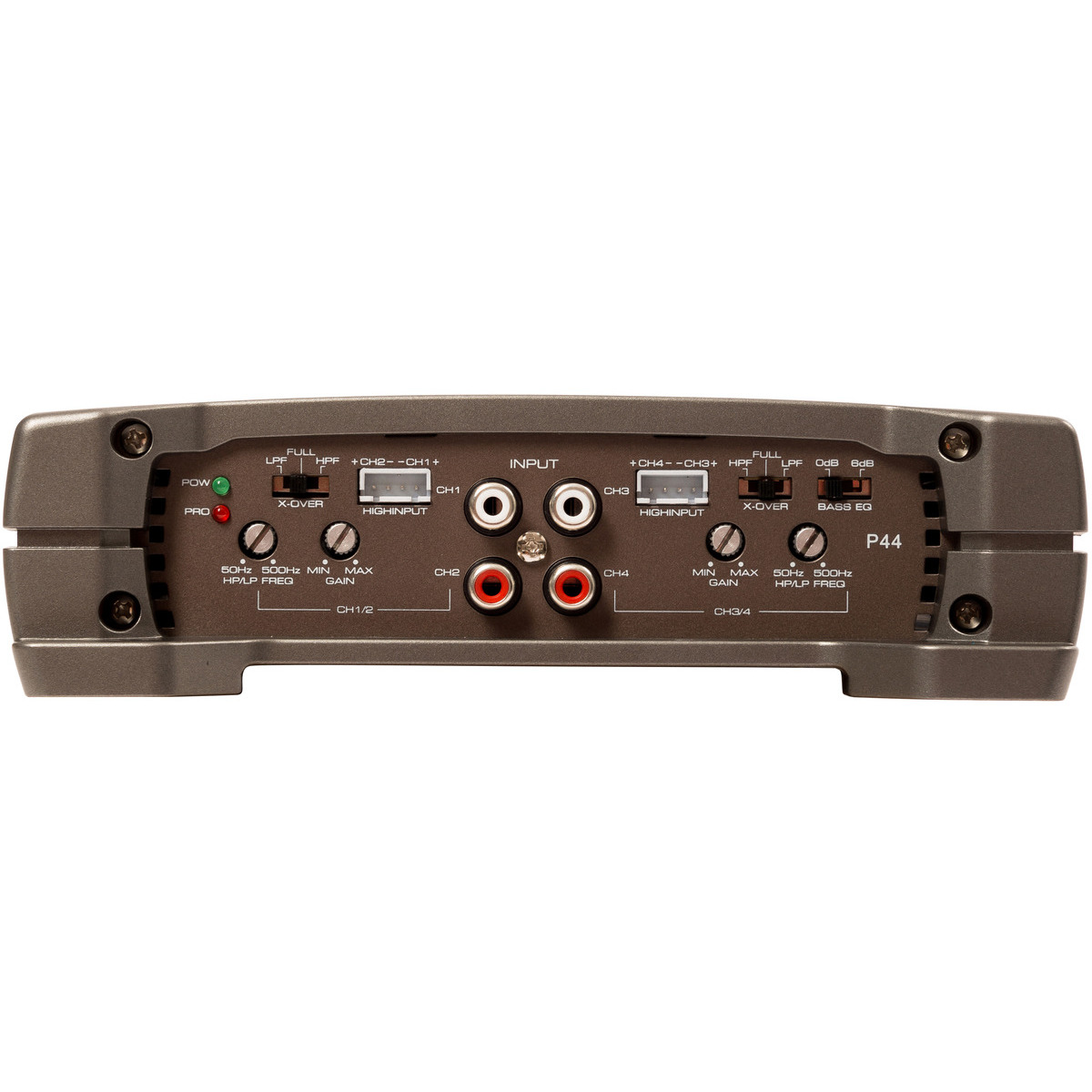 P44 is a small and powerful amplifier with a power output of 4 x 250 Watts peak power, and in mono bridge-connection, it puts out all of 2 x 280 Watts.