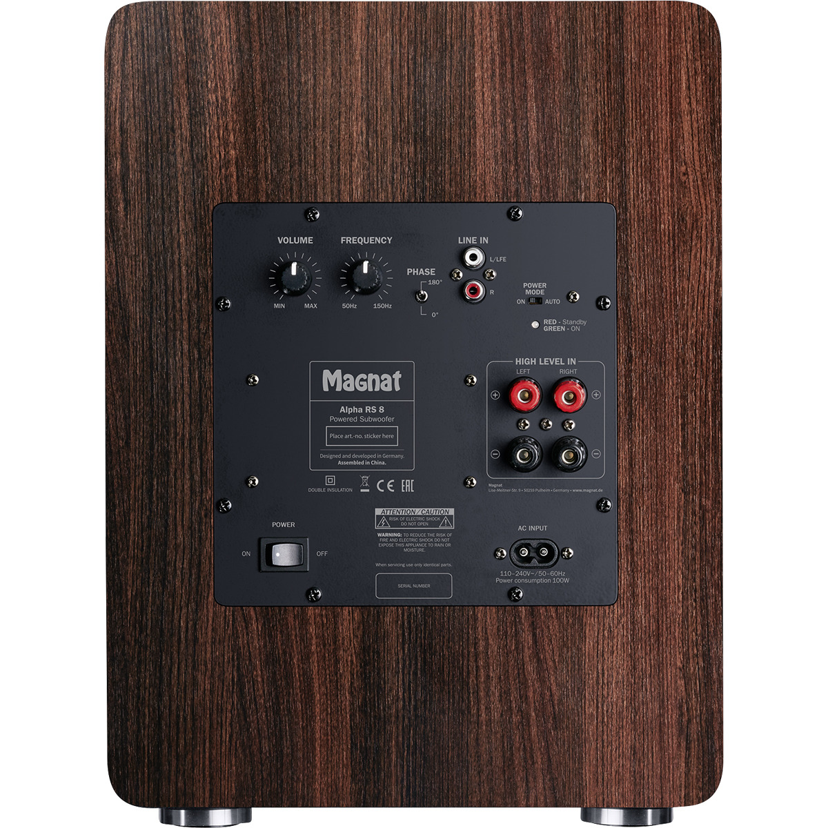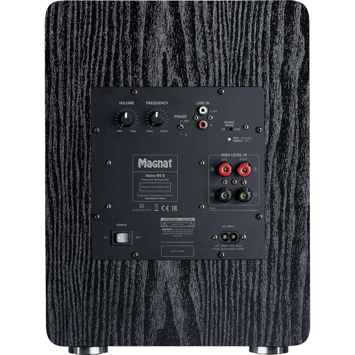 The Magnat Alpha RS 8 features a 200 mm (8 inch) high-power long-throw woofer in a bass reflex housing that is equipped with two Airflex ports. The integrated Class D amplifier delivers 80 watts of continuous power, while the peak power is an impressive 160 watts. The technology incorporated in the RS8 allows it to reproduce frequencies down to 25 Hz. The amplifier electronics allow the volume, crossover frequency and phase to be regulated, thereby enabling optimal adaptation to the acoustics of the room.
