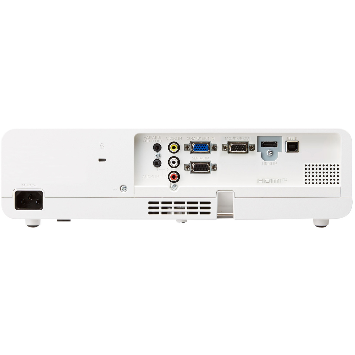 Extensive interfaces include an HDMI input terminal, 2 sets of computers (RGB) input terminals, a monitor (RGB) output terminal, a wired LAN terminal, and a serial (RS-232C) terminal for external control. These features support a wide range of system architectures for portable or ceiling-mounted use.
