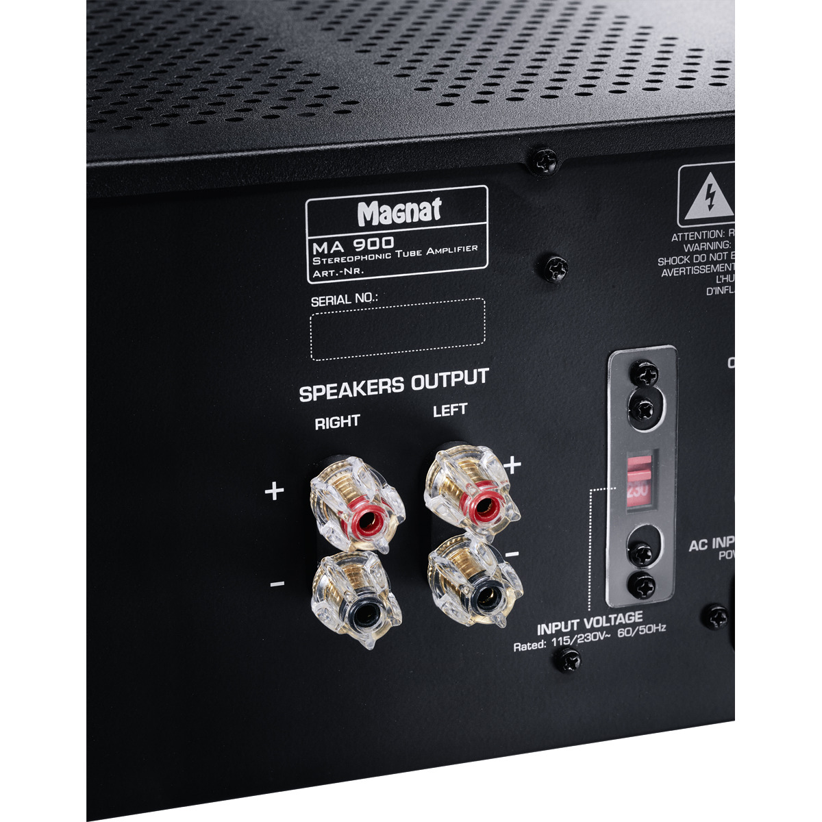 The combination of melodious tubes in the preamplifier unit together with powerful transistors turns the MA 900 into a hybrid amplifier; a product category that is rare but has a long tradition at Magnat. The tubes, which have already been burned-in for a perfect sound, are selected prior to assembly to ensure that a pair with perfectly compatible values is used.