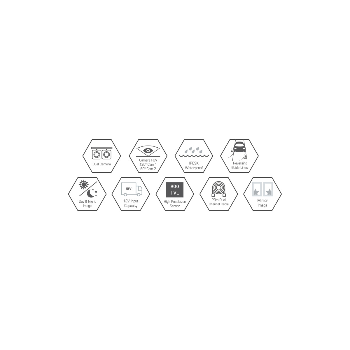 Camera 1 features a 120º wide angle field of view including guide lines for reversing and Camera 2 features a 60º field of view for viewing objects closer to your vehicle during parking. Includes a dedicated video out signal for each camera and a 20 metre dual channel video cable suitable for large recreational and commercial vehicles.