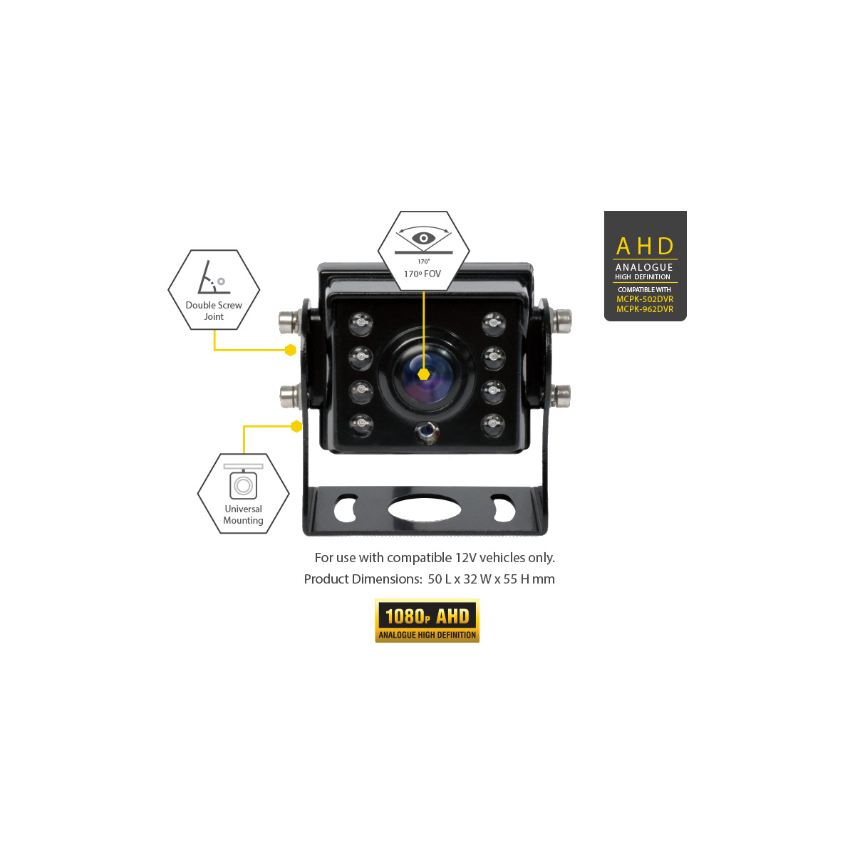 Parkmate Analogue High Definition (AHD) technology is the latest in vehicle electronics, delivering exceptional improvements with double the resolution of standard definition video. Records at 1080P AHD resolution when connected to compatible Parkmate DVR's and allows you to view the rear image when reverse gear is engaged. Includes 8 in-built high powered infra-red LED's for clear high resolution images in both day and night driving conditions.