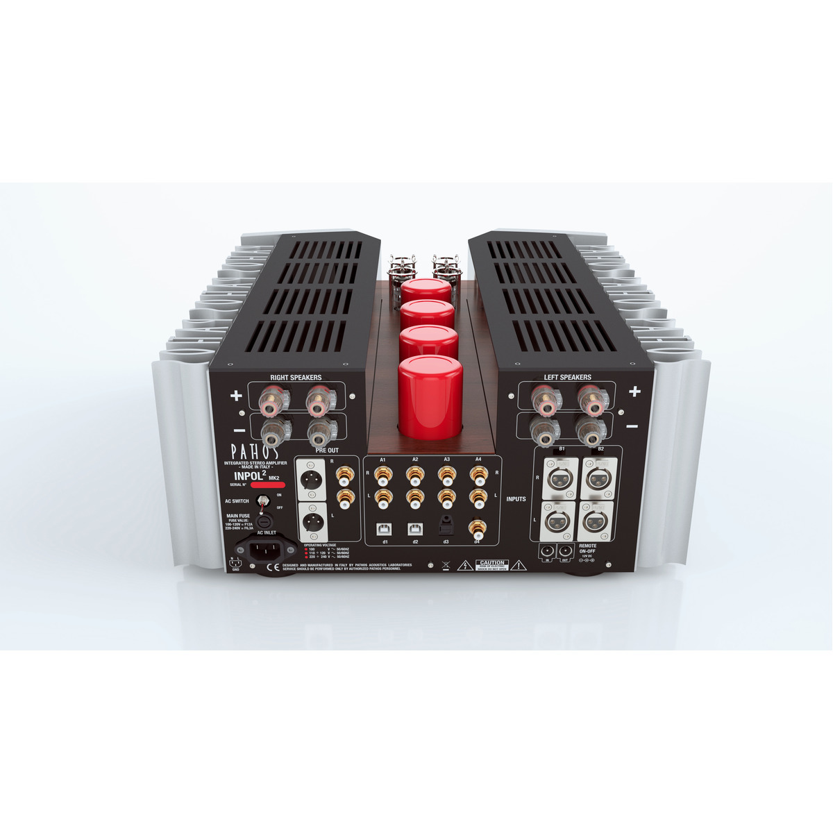 The Inpol2 amplifier is true balanced in a dual-mono configuration, offering 45 W of class-A power. It has a high bandwidth and zero feedback. InPol (Inseguitore Pompa Lineare - Linear Pump Follower) is a Pathos patented system that allows for much greater output in pure class A. This fully balanced circuit design uses a single solid-state component in follower configuration, with a high-current gain and voltage gain together.