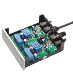 The input stages used in this device can also be found in top notch mixing consoles or in well known professional microphone preamps. The entirely passive RIAA equalization network is realised with high precision foil capacitors to realise an artefact-free transport of microdynamics and room information. The switches for gain and load settings have gold plated connectors for reliable performance.