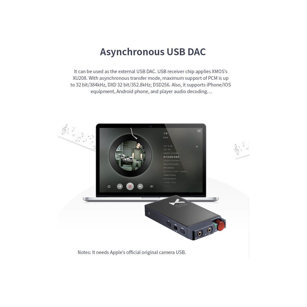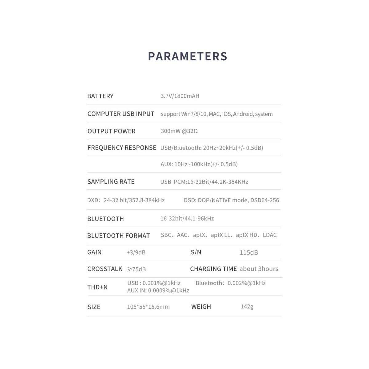 The DAC chip is ES9018K2M chip, which has excellent decoding performance and supports native DSD and DXD And PCM signal, maximum support PCM--32BIT/384KHZ, DSD256,DXD 32BIT/352.8KHZ