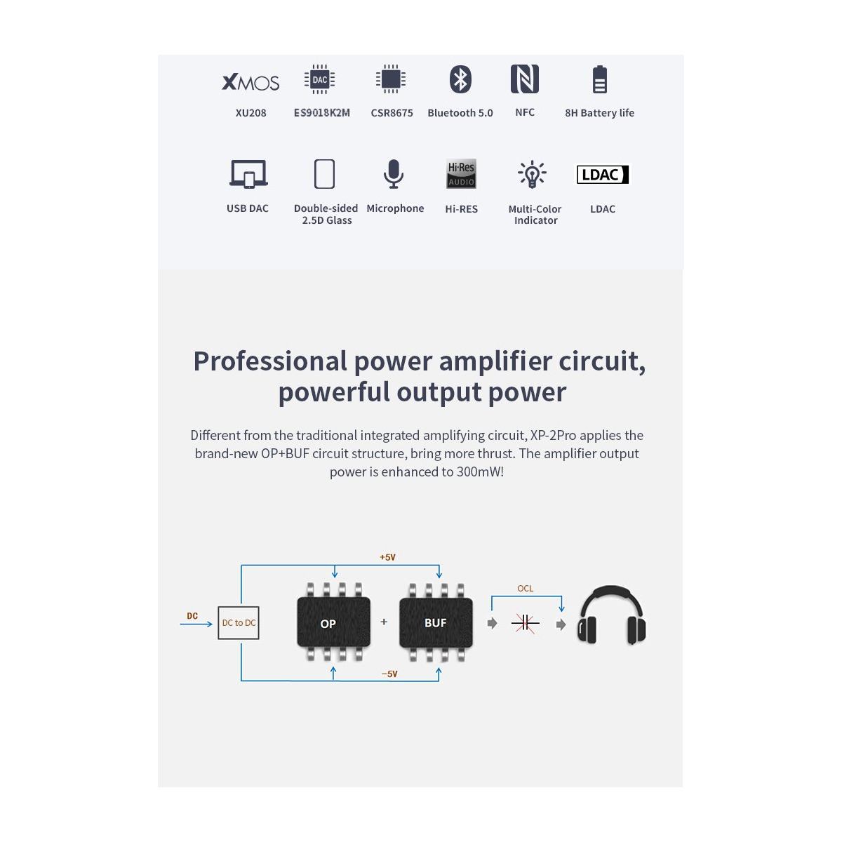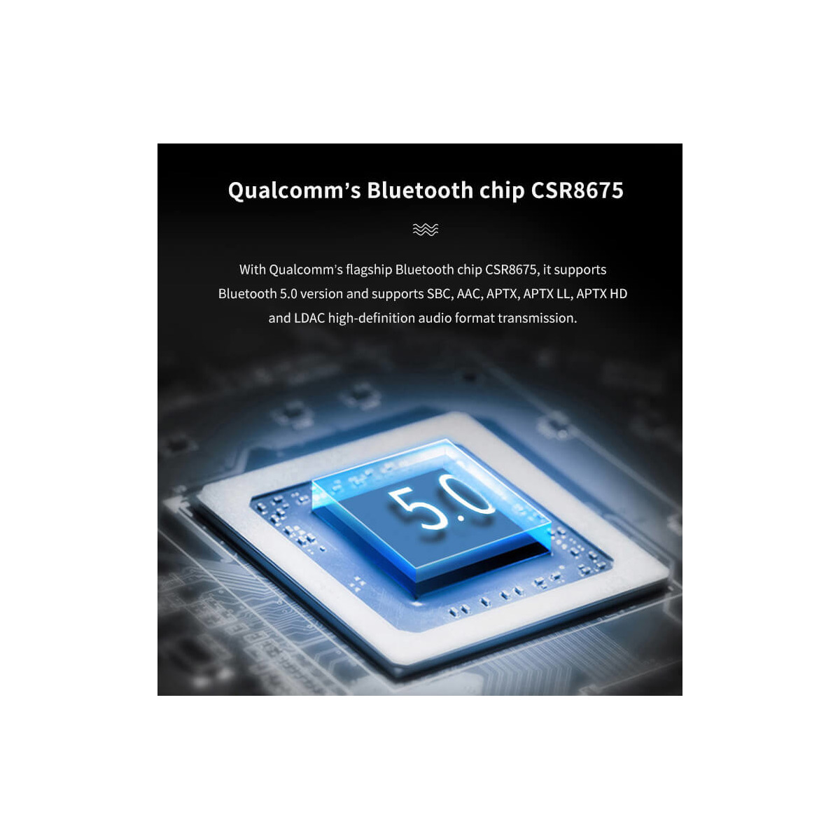 Using Bluetooth chip CSR8675, support Bluetooth 5.0 version, and support SBC,AAC, APTX, APTX LL, APTX HD, LDAC and other high-definition audio format transmission.