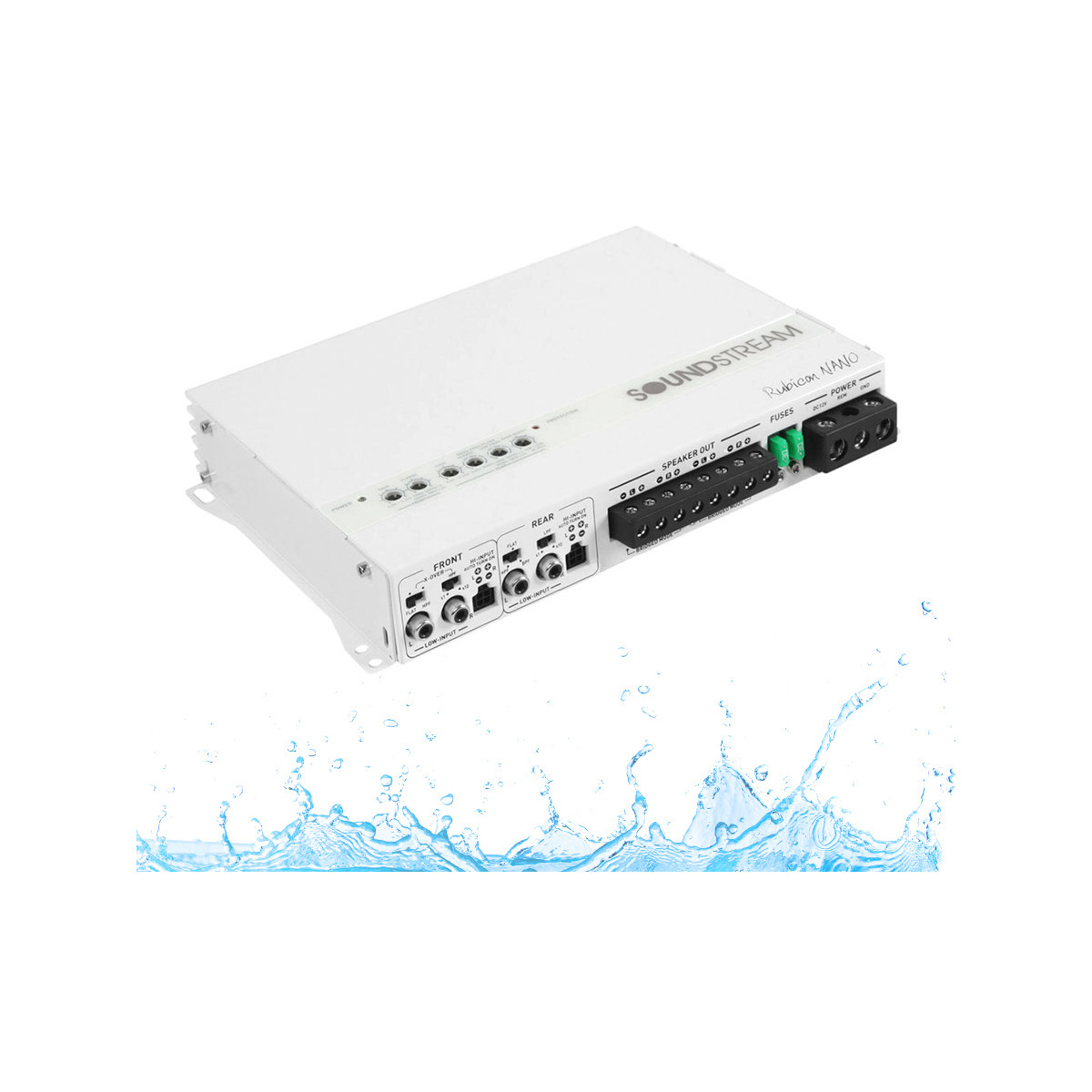 We’ve adopted the most optimum Class D performance, reliability, and smaller footprint platform for the Rubicon Nano series amplifiers and present to you Rubicon Nano. At first glance, you’ll notice this amplifier’s color; that’s the coat and finish to help this marinized model work for Marine or Powersports applications. Rubicon Nano’s signal inputs, power/ground, and speaker connections are all relocated to the leading edge of the chassis for an easier, more attractive install. All pre-amp & crossover options are appropriately located on the top surface, making adjustments after installation conceivable. You might not notice embellishments to the circuit board, including increased power supply & output stage components & Monoblock bridging capability.