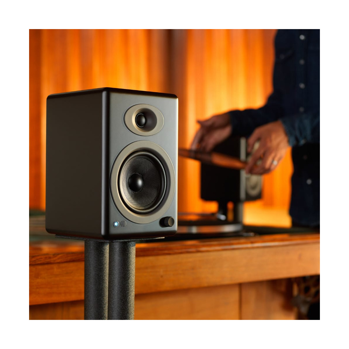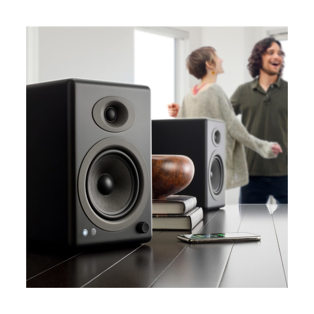 The A5+ Wireless uses the same amplifier design and woofers that the A5+ Classic does, so both the A5+ Wireless and the A5+ Classic should sound virtually the same. The biggest difference between the two is the added Bluetooth receiver built into the A5+ Wireless; we’ve added a 24-bit DAC built inside that connects any bluetooth capable device (whether be your phone, tablet, or computer) to the speakers so you can stream high-quality music directly without having to use audio cables. The A5+ Wireless also features a minor cosmetic refresh; the most obvious of which includes centering the tweeters, as opposed to the offset tweeters featured on the A5+ Classic.