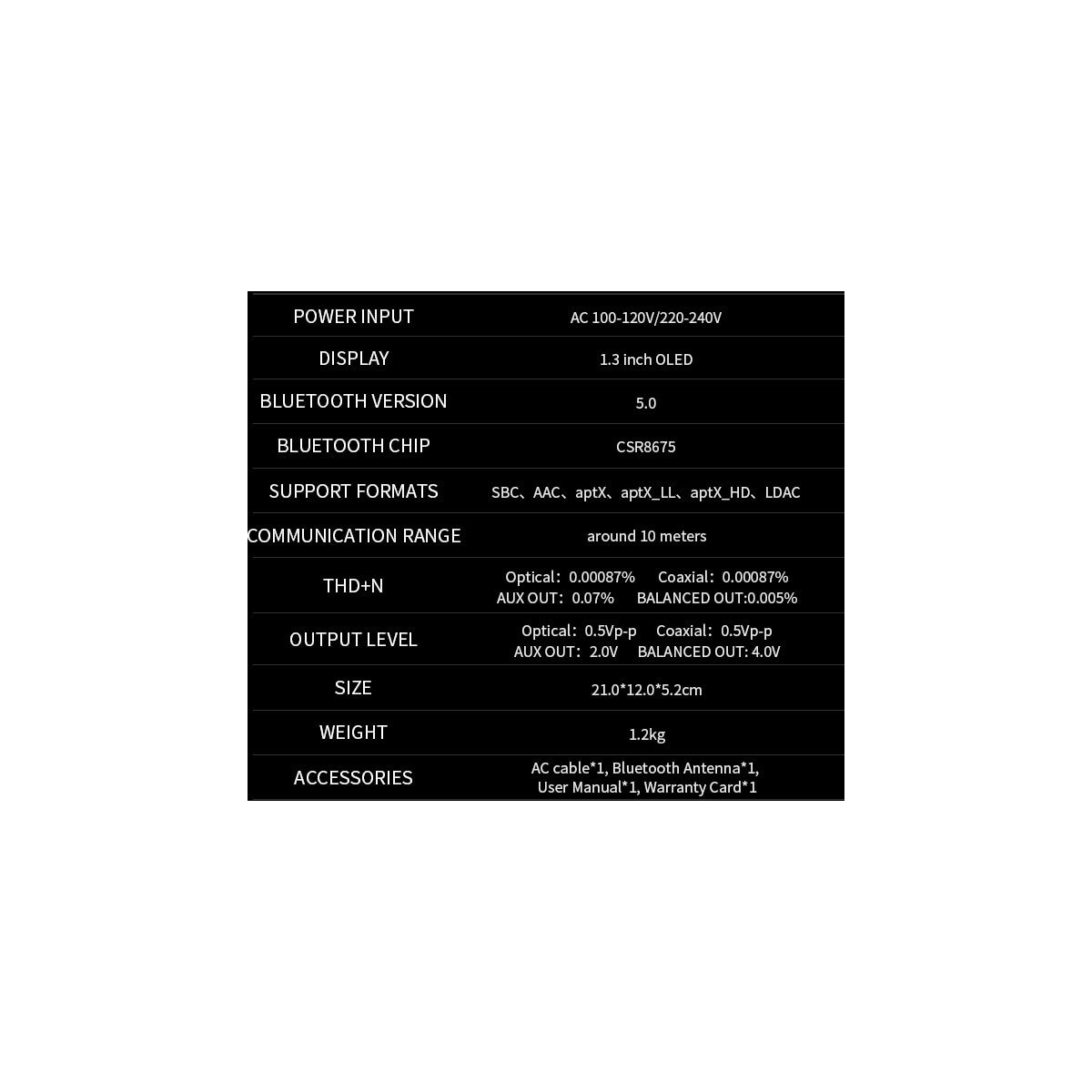 - Adopt CSR8675 Bluetooth chip, support SBC, AAC, aptX HD, LDAC, and other audio formats