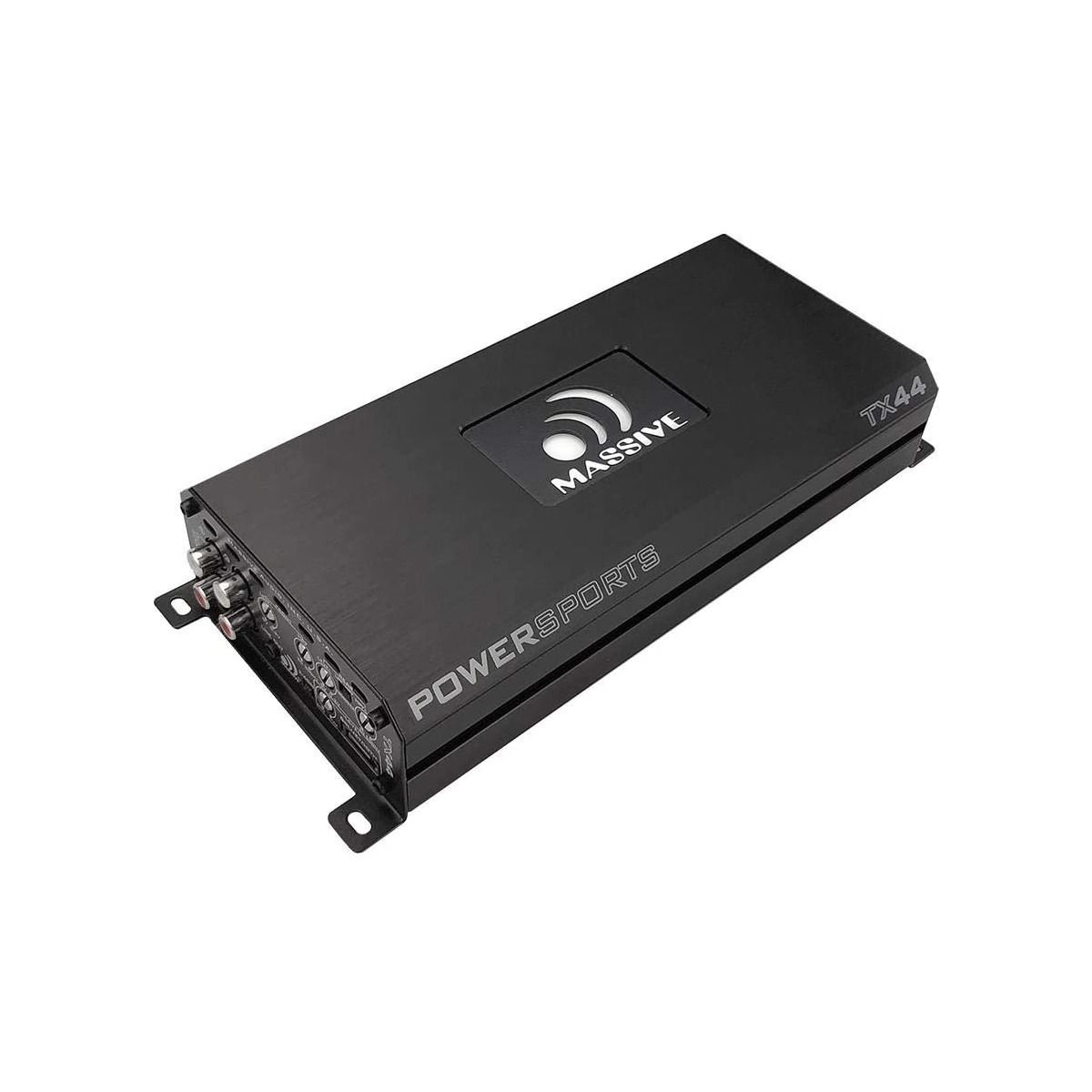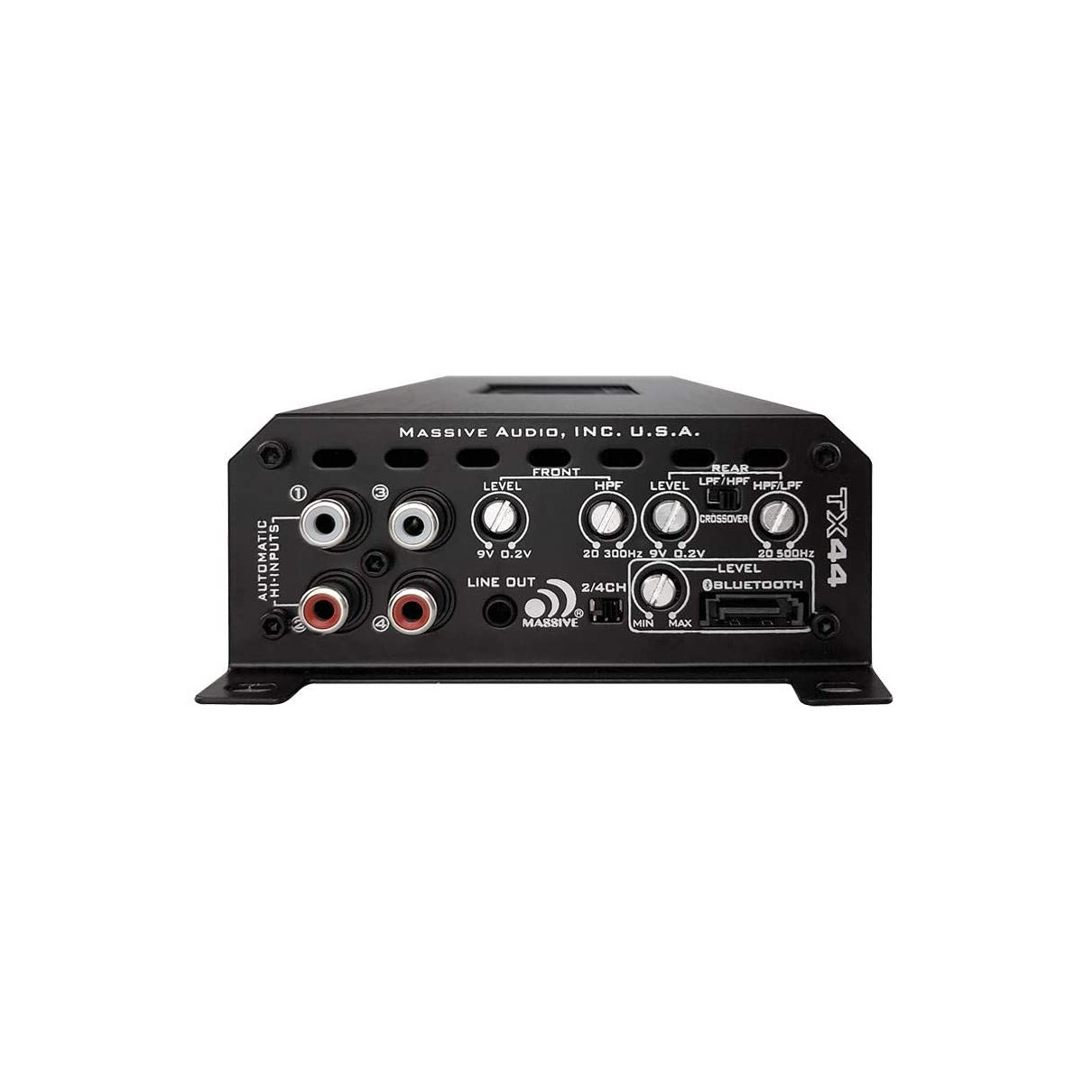 The TX44 is rated at 480 x 2 Watts RMS in Bridged Mode or 120 Watts X 4 @ 4Ω Stereo. Inside you will find our 4 Layer PCB of Class D design including Surface Mounted parts and Like all Massive Audio Amplifiers, you’ll find our advanced 5 Way Protection Circuitry and a full array of adjustments to adapt to any system configuration including 2/4 Channel input switching and Full Range Line Output for Monoblock Linking . Another example is the flexible LPF/HPF/FULL Crossover Switching choices.
