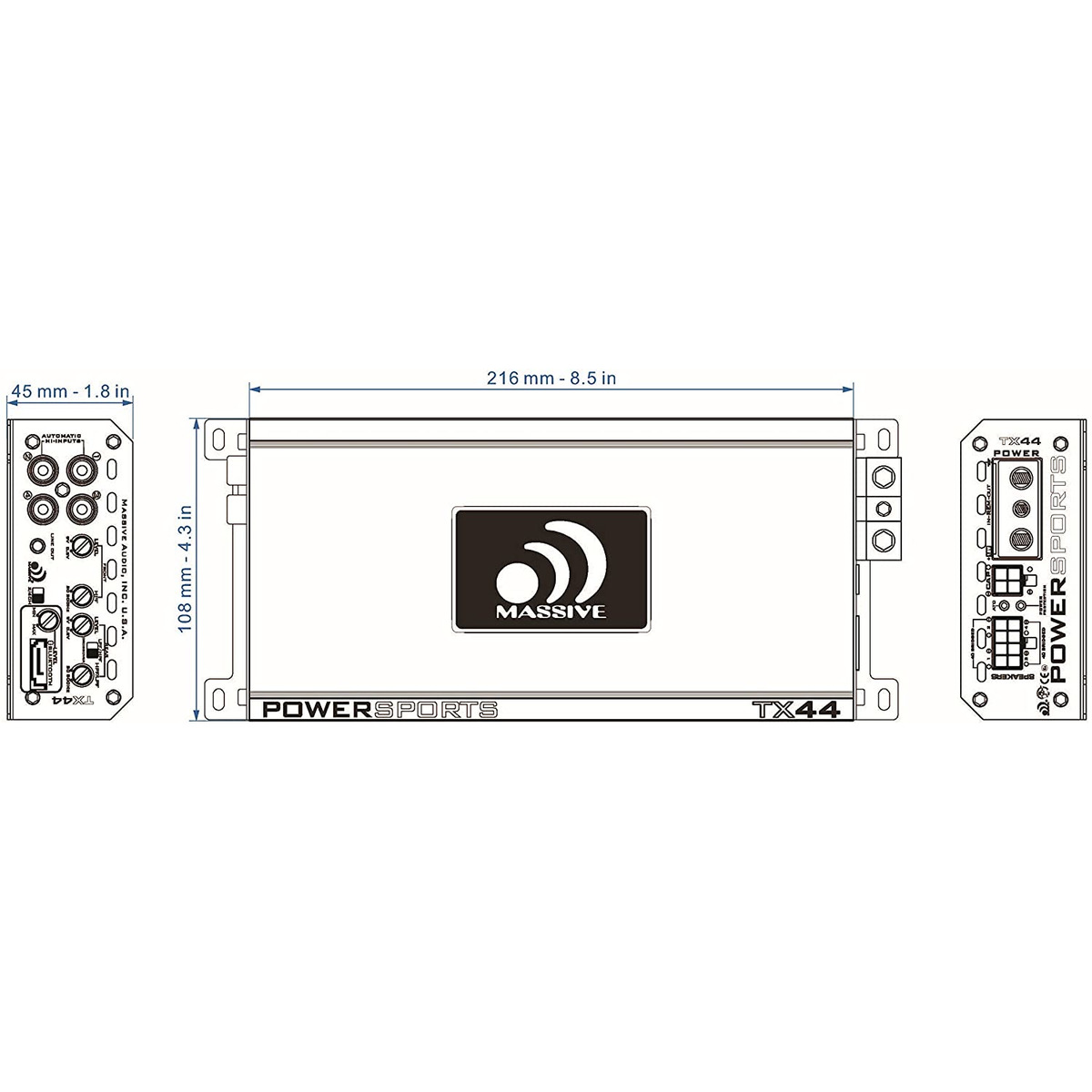 Massive Audio’s TRIDENT Series Amplifiers come dressed for action in their black anodized brushed aluminum heat-sink, punctuated with stainless-steel end caps and a blue backlit logo. The two primary features of this Amplifier are its IP65 Certified resistance to Water and its unique Bluetooth capability. Resistance to Water and Harsh Elements make it perfect for Marine Audio system applications and is a result of our utilizing a Dura-Coated 320°F Epoxy PCB and use of nickel plated RCA inputs.