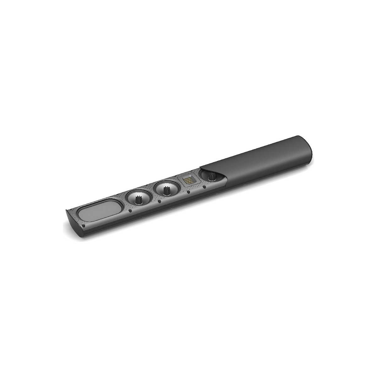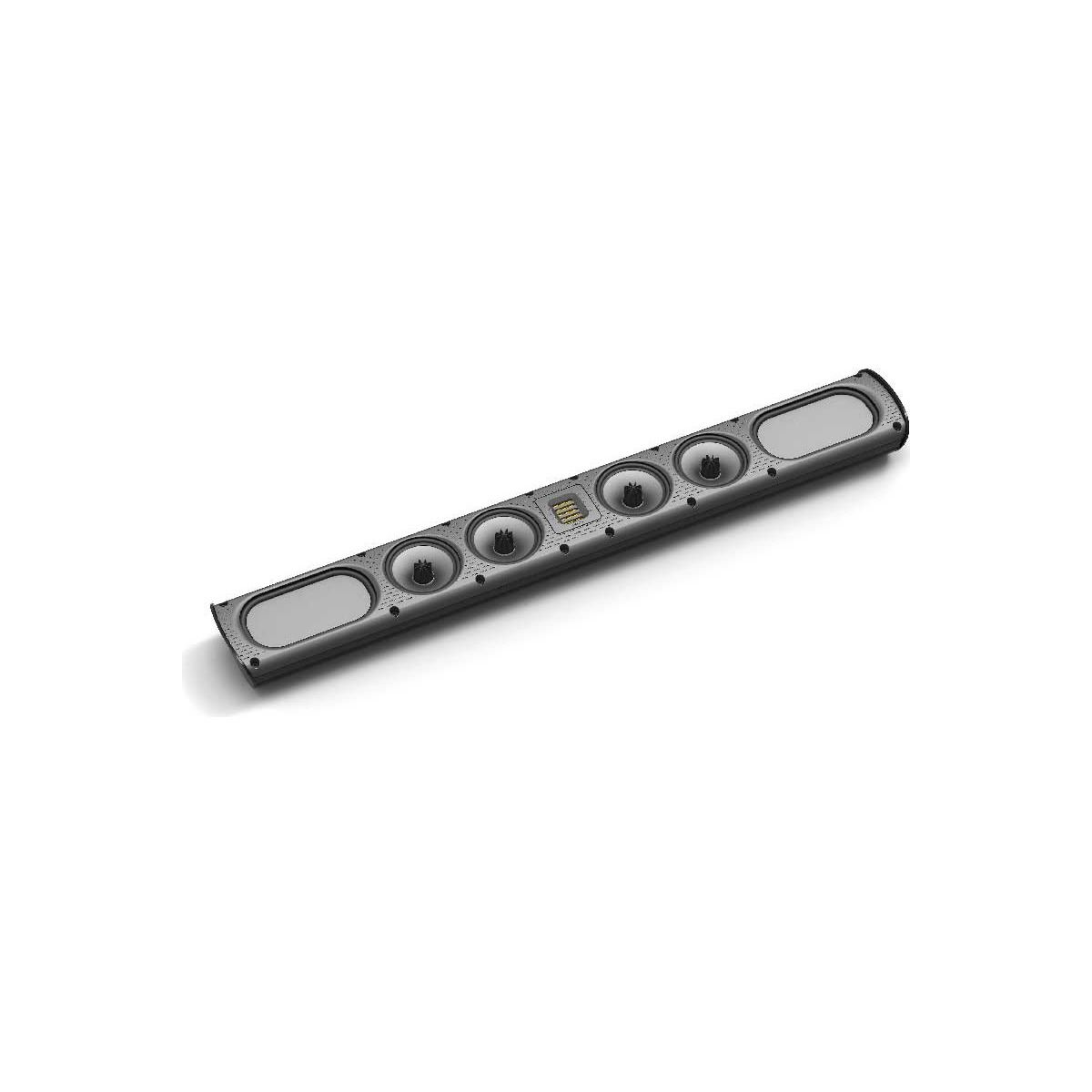The sleek, attractively sculpted cabinet follows the same design philosophy that won the SuperSat 50 the highly respected Resi Award as the industry’s best looking on-wall loudspeaker. It is constructed from aerospace-grade aluminum and finished in gorgeous piano-gloss black. It contains four GoldenEar engineered 4.5" cast spiderleg-basket bass/midrange drivers with Multi-Vaned Phase-Plugs (MVPP) configured in a two-stage D’Appolito Array surrounding our signature High-Velocity Folded Ribbon high-frequency radiator. Two 4" x 7" quadratic planar low frequency radiators complete the driver complement, perfectly loading the bass/midrange drivers for open, boxless midrange and extended low-frequency response.