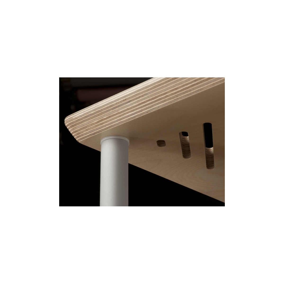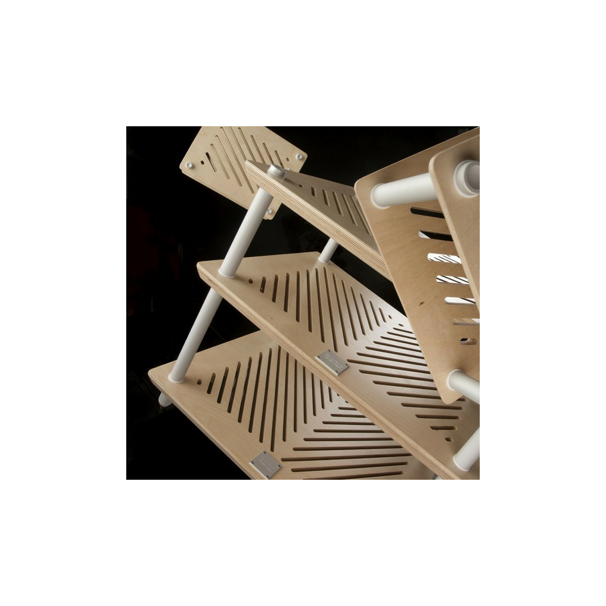 Stage 1000 is a wooden audio rack designed to reduce the effects of resonant frequencies with diagonal slits of varying lengths and solid posts.