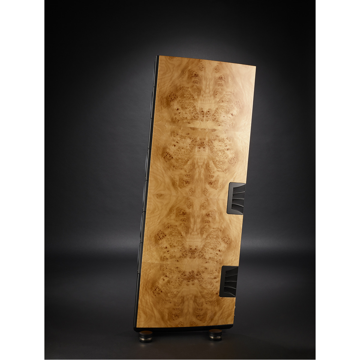 It has taken the latest diamond and tungsten carbide, segmented spiral cutting heads and most sophisticated, high-speed CNC technology to make Birdseye Maple Burl an available – if expensive – veneer, usually confined to the luxury interiors of private jets and super-cars. But at Raidho we believe that the ground-breaking musical performance of the X5 Series deserves the best and most beautiful finishes possible, that its lines and heritage demand the finest and rarest of woods to grace its cabinet. So, as well as classic piano black, the X5 Series will be available in an optional Birdseye Maple Burl finish. Take one look at the stunning contrast of sharp lines and soaring surfaces with the organic intricacies of the natural wood finish and we are sure that you will agree, this really is beauty beyond price – but at a price that is surprisingly affordable.