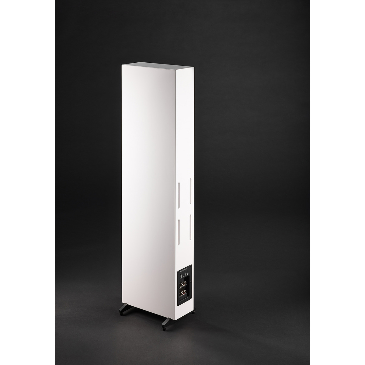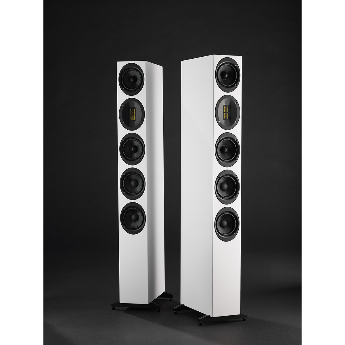 The M40 is a powerfull and elegant 2.5-way, floor-standing speaker. The speaker features a high-resolution ribbon tweeter, normally only seen in much higher priced products. In the M40, the tweeter blends seamlessly with two 4” honeycomb enforced glass-fiber midrange/ woofer drivers, arranged in a MTM configuration. The two midrange/woofer drivers are supported in the lower frequency regions by an array of 2 dedicated bass drivers. Don’t let the slim and elegant looks fool you – the M40 can really rock the house, when it’s four 4,5” woofers are put to work.