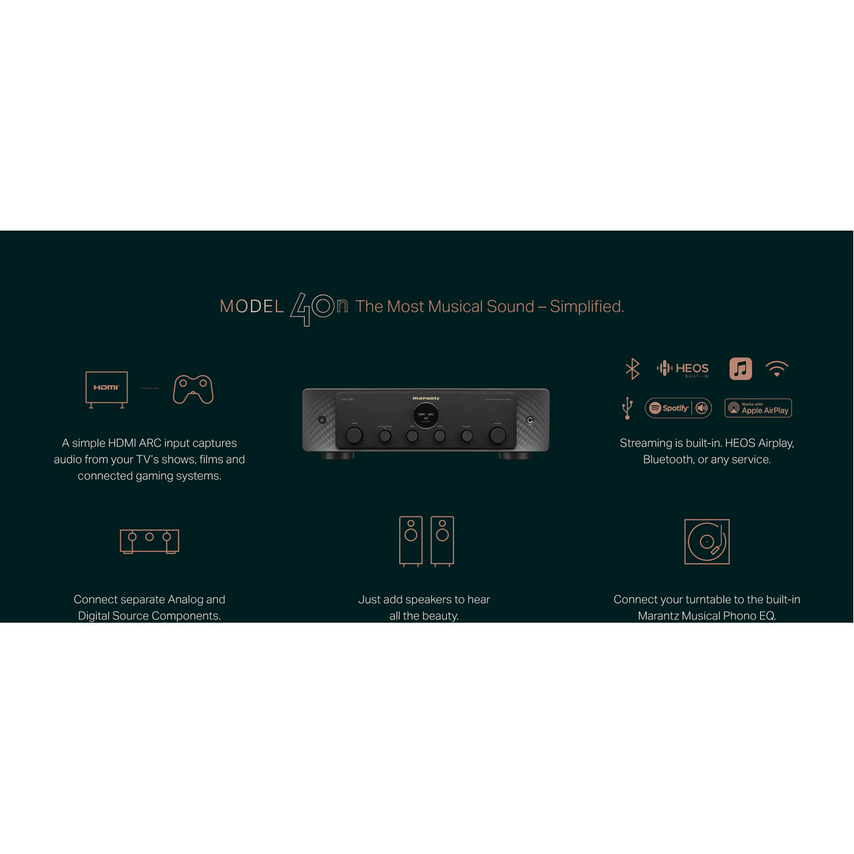 The joy of vinyl playback is both audible and tactile yet requires highly specialized electronics for high performance. The Marantz Musical Phono EQ is built in so you can connect a turntable with MM cartridge directly to MODEL 40n. You’ll enjoy your favourite records and discover new ones, all without the burden of additional electronics.
