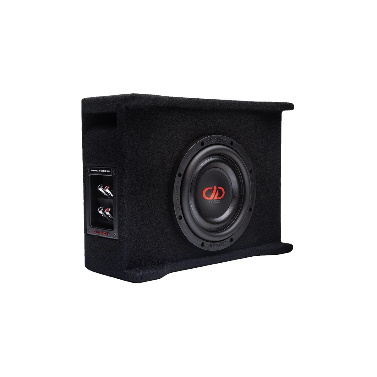 The SL600s use an EROM rubber surround profile mated to a highly rigid, composite sandwiched convex/concave flat cone to deliver a detailed low frequency from its small volume air space. This allows the DF enclosures to be extremely compact in size while still giving the vehicle a concert hall quality sound. These classy enclosures are made from 18mm MDF, internally braced and sharply finished in embroidered carpet with a two tone, aluminum DD logo plate bolted in front.