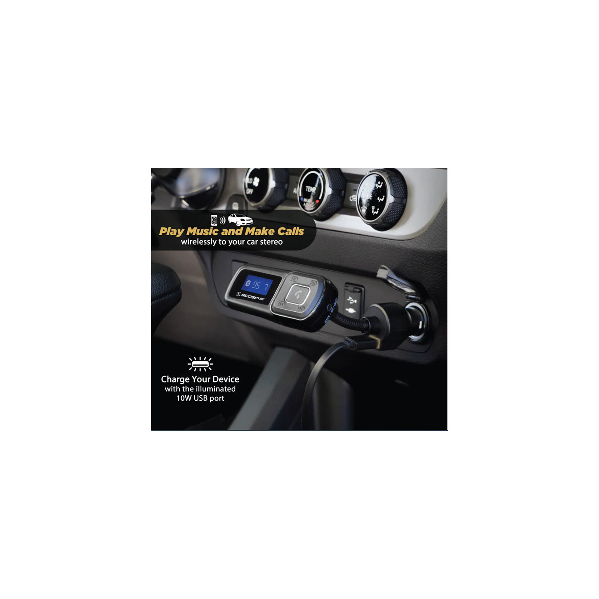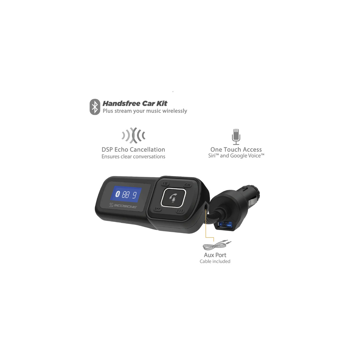 • Charge your device with the 10-Watt 2.1AMP USB port on the 12V car charger and control the BTFREQ’s volume up/down, play/pause, answer/hang up the phone or voice controls like Siri and Google Voice.
