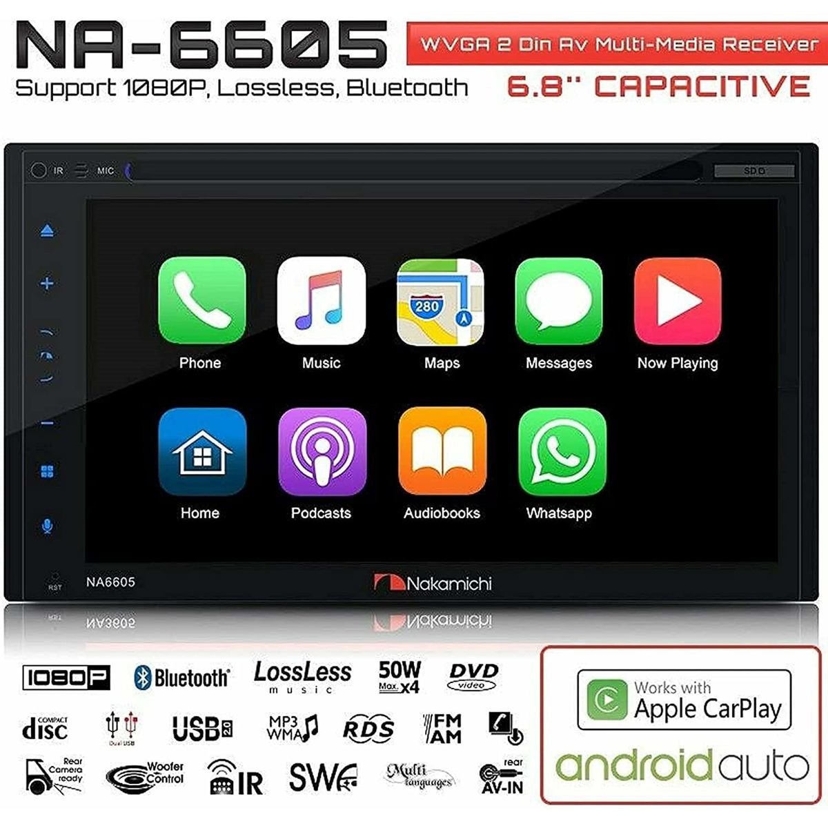 Nakamichi's NA6605 is a double DIN DVR receiver with a 6.8-inch capacitive touch screen that includes 4V preamp output, front and rear USB inputs, dual camera inputs and dual video outputs. This unit works with Apple Car Play and Android Auto, and is engineered to be suitable for universal use across all vehicle models. Take command of your entertainment library and mobile audio/video/app experiences with the NA6605