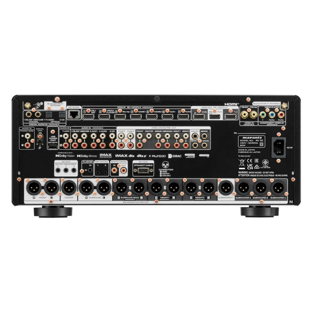 The Marantz AV 30 Preamplifier delivers exceptional performance and capability for large media rooms and dedicated home theatre systems. This 11.4-channel balanced AV preamplifier features Marantz HDAM discrete circuitry and boasts seven HDMI inputs, each of which is 8K Ultra HD compatible. Powered by HEOS™ for high-resolution music streaming, AV 30 includes room correction with Audyssey MultEQ XT32 and optional Dirac Live. It delivers Dolby Atmos, DTS:X Pro, AURO-3D, and features multiple inputs and balanced pre-amp outputs for all channels, including four independent subwoofers.