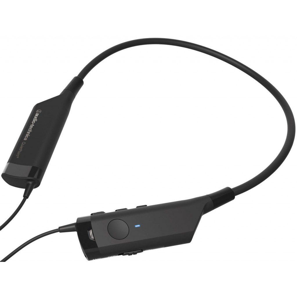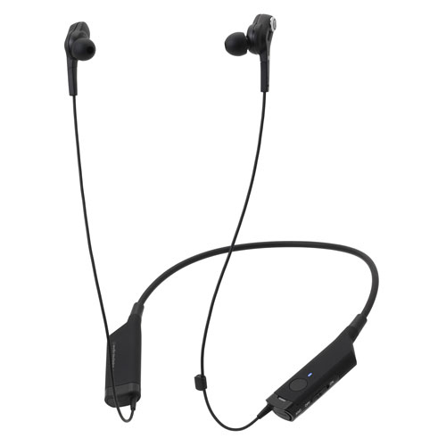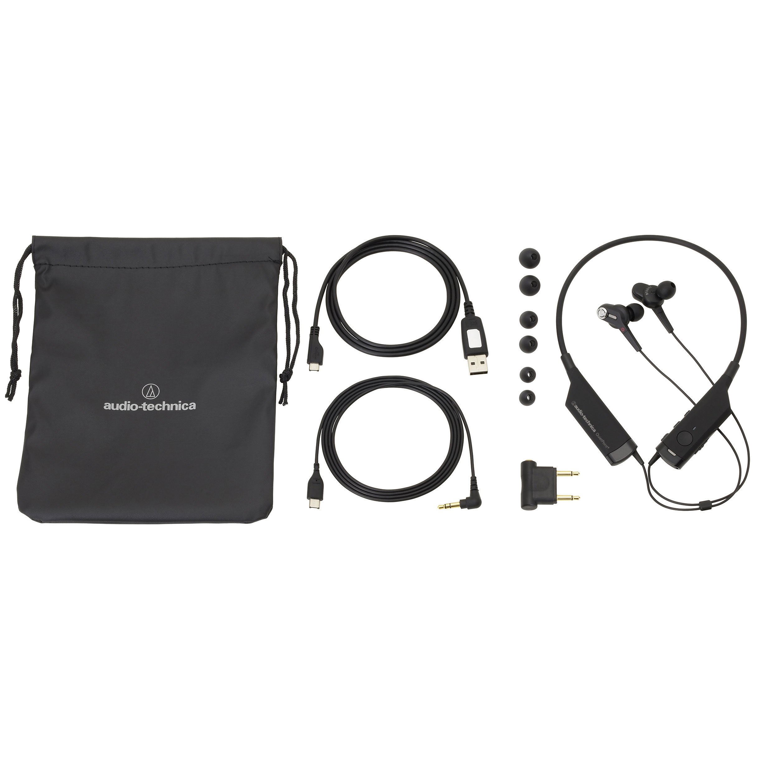 Type Active noise-cancelling Driver Diameter 13.5 mm Quietpoint Active Noise Reduction Up to 20 dB Maximum Input Power 10 mW Sensitivity 100 dB Battery DC3.7 V lithium polymer rechargeable battery Battery Life Approx. 8 hours (when Bluetooth and noise-cancellation used) Approx. 13 hours (when only Bluetooth used) Approx. 24 hours (when only noise-cancellation used) Max. 100 hours (standby) Charging Time: Approx. 3 hours (for 0-100% charge) Weight 35 g (1.2 oz) without eartips Cable 1.2 m (3.9') with 3.5 mm stereo mini-plug Accessories Included Eartips (XS, S, M, L), 1.0 m (3.3') USB charging cable, airplane adapter, protective pouch Type (Microphone) Condenser Sensitivity (Microphone) -42 dB (1V/Pa at 1 kHz) Frequency Response (Microphone) 70 8,000 Hz Polar Pattern (Microphone) Omnidirectional The ATH-ANC40BT QuietPoint wireless in-ear headphones combine Audio-Technicas proprietary active noise-cancelling technology with Bluetooth wireless technology to give you greater freedom and listening pleasure in areas of high ambient noise. The wireless headphones reduce that distracting background noise by up to 90% while the 13.5 mm drivers deliver superior sound reproduction. The Bluetooth functionality, coupled with an in-line mic and controls, lets you operate hands-free, wirelessly answering/ending calls, controlling music playback and adjusting volume on Bluetooth enabled devices. The headphones pair with up to eight Bluetooth enabled devices, and can be connected with two of those devices simultaneously, allowing you to shift seamlessly between your phone and tablet, phone and laptop or any other pair of Bluetooth enabled devices. The ATH-ANC40BT headphones also employ aptX sound-improvement technology, specifically created to yield the best-possible audio performance over Bluetooth transmission. Engineered to create a comfortable listening environment in areas with high ambient noise, these wireless in-ear headphones feature a miniature microphone in each earpiece that picks up ambient noise (such as traffic, air-handling systems, etc.). Electronics in the QuietPoint control module create a noise-cancelling wave that is 180 out of phase with the ambient noise. This wave acts like a noise eraser: it cancels out the annoying sounds that surround you without diminishing the audio you want to hear. The result: a peaceful enclave to enjoy the music or movies of your choice. The ATH-ANC40BT wireless headphones feature a convenient neck band design that loops the cable from ear to ear around the back of your neck so you dont have to deal with any dangling cords. However, the headphones also come with a detachable 1.2 m (3.9') cable with 3.5 mm stereo mini-plug that can be used to create a standard wired connection helpful in areas where Bluetooth wireless operation is prohibited or for when the power from the internal DC3.7 lithium polymer battery gets low. Also included are silicone eartips (XS/S/M/L), a 1.0 m (3.3') USB charging cable, an airplane adapter, and a protective pouch.