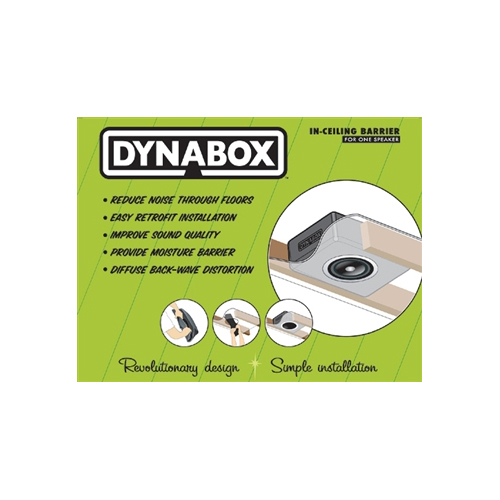 Improving the sound quality of your in-ceiling speakers and stopping noise transfer to other rooms is the goal of all pro-audio enthusiasts. While speaker quality is high on the priority list, so is the placement and proper installation of speakers. One item to consider when installing your in-ceiling speakers is DynaBox -- a retrofitting ceiling speaker enclosure from Dynamic Control. Designed for both new and existing home theaters, DynoBox isolates vibration and noise so it doesn't migrate to other rooms -- resulting in pure, high-quality sound with limited collateral disturbance. The system is made from a one-pound-per-square-foot flexible vinyl sound barrier and a triple-layered acoustic coupler called the sound snake, along with ultra-high efficiency acoustic foam. This combination creates an acoustic vault that completely encases the back of the speaker and performs like a well-crafted solid speaker cabinet. Features: -Unique retrofit-able ceiling speaker enclosure that completely encases the speaker, effectively reducing sound migration between rooms, ceilings and floors -Projects more clear sound into the room and reduces unwanted sound travelling outside the room -Can be completely collapsed, inserted into an existing speaker opening and expanded back out -Can be installed quickly and easily, eliminating the need for custom-constructed boxes that are cumbersome, time consuming, and costly -Designed for both new and existing home theatres Technical Specifications: -Appearance: Black flexivinyl barrier -Color: Charcoal grey -STC: 28 -Mass: 1lb/square ft. -Material Thickness: 0.09 inches -Temperatue Resistance: -40 F to 220 F (-40 C to 105 C) -Chemical Resistance: Resistant to water and mineral oils -Dimensions: 17" x 12" x 6.5" (438mm x 311mm x 165mm) -BACKWAVE FOAM -Dimensions: 13.5" x 9" x 1" (343, x 229mm x 25mm) -Mass: 0.16 lb/ft^2 (0.78 kg/m^2) -Density: 2.0 lb/ft^3 (0.125 kg/m^3 -Tensile Strength: 15psi -Tear Strength: 1.9 -Thermal Conductivity (R): 1.9 (hr-ft^2-deg.F/BTU) -Standards: Meets UL94 HF-1 -Temperature Range (Resistance): -40 F to 225 F (-40 C to 107 C) -SOUND SNAKE -Thickness: 1.5" (38.1mm) total -Density: 2.0lb/ft^3 (0.125 kg/m^3) -Tensile Strength: 1.9 -Thermal Conductivity (R): 1.9(hr-ft^2-deg.F/BTU -Temperature Range (Resistance): -40 F to 225 F (-40 C to 107 C) -DYNIL -Appearance: Black flexivinyl barrier -Color: Charcoal grey -Standards: Meets UL94-V0 -Temperature Range (Resistance): -40 F to 220 F (-40 C to 105 C)