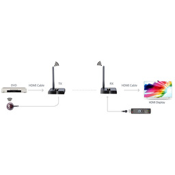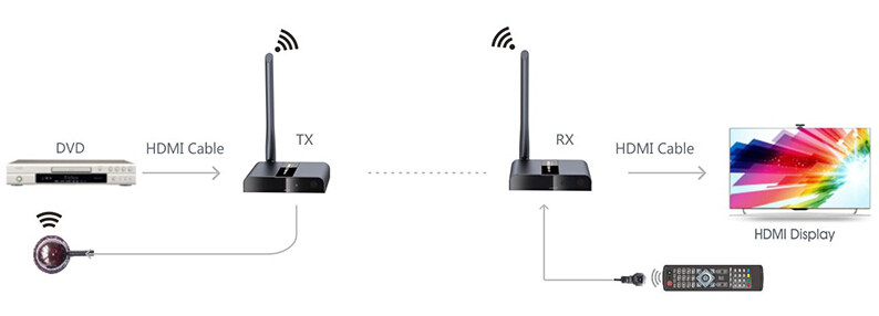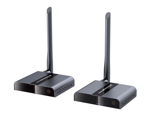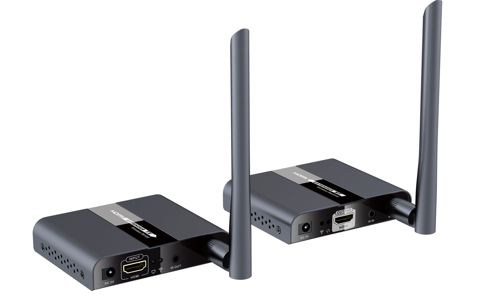 LENKENG HDMI Wireless Matrix Extender. 2x2 HDMI matrix HDMI switch. 1080p Full HD. Support IR passback. 50m Transmission distance. This HDMI wireless extender includes transmitter unit and receiver unit, which allows you to transmit and extend HDMI signal for up to 50meters wirelessly. It has a strong anti-interference ability by running at 5GHz. This wireless extender not only supports point to point configuration but also supports one to many (1 to 2) and many to many (2 to 2, 2 to 1) configuration. This extender supports a wide range of IR passback frequency 20-60KHz to realize remote control of source devices from receiver side. This is a very good solution for transmitting one or more HDMI source signals to one or more screens over a long distance without running wires. Note: 1) Transmission distance will be different due to the environment. 2) Wall, brick or glass will shorten the signal cover range or cause big signal loss. 3) It is recommended that the distance between each unit should be more than 5 meters. Features Smart portable design, wonderful performance. Highest resolution up to 1080p full HD. Strong anti-interference ability by running at 5GHz operation frequency. Support point to point configuration, one to many (1 to 2) configuration and many to many (2 to 2, 2 to 1) configuration. Support IR passback with 20-60KHz frequency. Supports button control to set channels and IR controller to switch and choose input sources from receiver side. 50m long range transmission distance. Items Specification Voltage/Current DC5V/2A Power consumption TX<7W Rx<5W HDMI compliance HDMI1.3 HDCP compliance HDCP1.2 HDMI resolution supported 480i@60Hz、480p@60Hz、 576i@50Hz、576p@50Hz、 720p@50/60Hz、1080i@50/60Hz、 1080p@50/60Hz Supports audio formats L/R stereo audio Maximum transfer rate 10.2Gbps Audio signal transmission format L/R stereo audio Input and output TMDS signal 0.5~1.5Vp-p(TMDS) Input and output DDC signal 5Vp-p(TTL) Input cable length supported ≤5m(AWG26 HDMI1.3cable standard) Output cable length supported ≤5m(AWG26 HDMI1.3cable standard) IR remote control Support IR passback with 20-60KHz frequency Transmission method 5.8G Wireless transmission Transmission distance 50 Meters Latency ≤200 ms Electrostatic protection of the whole machine 1a Contact discharge level 3 1b Air discharge level 3 Standard: IEC61000-4-2 Working temperature 0℃~50℃ Storage temperature -10℃~70℃ Humidity (no condensation) 0% ~90% Dimension 95(W) x 120.58(D) x 20.1(H)mm Material Iron alloy material + crystal panel Processing technology Sandblasting Colour black Weight TX: 200g,RX: 200g Mean time between failures (MTBF) >30000 Hours