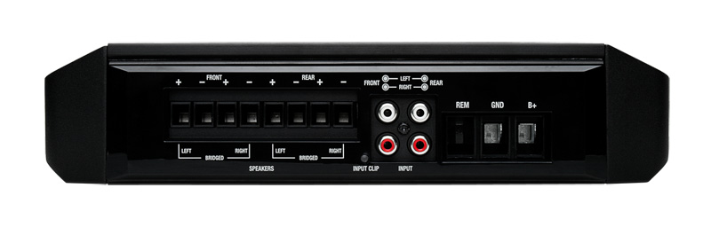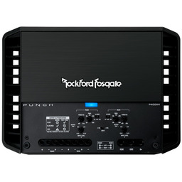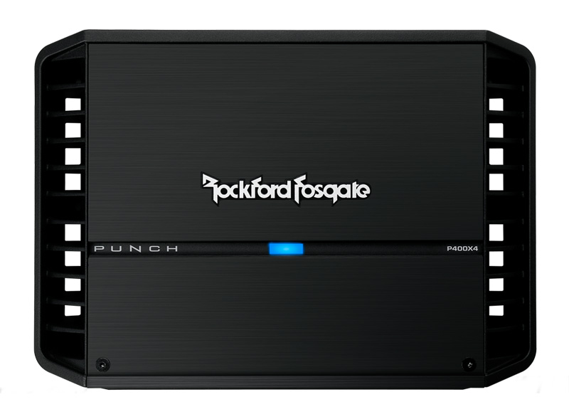 The Punch P400X4 is a 4-channel amplifier producing 100 Watts into all four channels at 2-Ohm. The P400X4 is perfect for a 4-way full-range system or a 3-way system having a front stage with subwoofers on the rear channels. The P400X4 is perfect for 4-way front-stage/rear-fill or 3-way front-stage/subwoofer systems. Simply drop a pair of component speakers on the front channels and subs on the rear and BOOM - you got "The PUNCH." With its flexible design, the P400X4 is an excellent amplifier choice for virtually any vehicle. -High level input capable with Auto Turn-On circuit -Features C.L.E.A.N. Set-up -12dB/octave Butterworth crossover -On-board Punch EQ with +18dB boost @ 45Hz. -Muted turn on -Stealth top mounted control panel -Cast aluminum heatsink -Short circuit protection -Over current protection CEA-2006 Guidelines CEA-2006 Power Rating 50W x 4 @ 4OHM 1.0% THD+N Number of Channels: 4 Rated Power (RMS Continuous Power): 50 Watts x 4 @ 4-Ohm 100 Watts x 4 @ 2-Ohm 200 Watts x 2 @ 4-Ohm Bridged Total Power (Sum of Rated Power): 400 Watts Dynamic Power (PVC / PowerCube): 82 Watts x 4 @ 4-Ohm 137 Watts x 4 @ 2-Ohm 266 Watts x 2 @ 4-Ohm Bridged Bridgeable: Yes Frequency Response: 20Hz to 20kHz + / - 1.0dB Efficiency (average): 67% @ 4-Ohm Total Harmonic Distortion (THD+Noise): 4-Ohm: <1.0% 2-Ohm: <1.0% Crossover Controls: Front High-Pass / Low-Pass (HP / LP): 50Hz-250Hz @ 12dB / octave Butterworth Rear High-Pass / Low-Pass (HP / LP): 50Hz-250Hz @ 12dB / octave Butterworth All-Pass: Yes Tone Controls: Front Punch EQ2 Bass: 0dB to +18dB @ 45Hz and / or Front Punch EQ2 Treble: 0dB to +12dB @ 12.5kHz Rear Punch EQ2 Bass: 0dB to +18dB @ 45Hz and / or Rear Punch EQ2 Treble: 0dB to +12dB @ 12.5kHz Function depends upon LP / AP / HP switch position Input Sensitivity: 150 mV - 12 V Signal Input: Hi / Low level: 2 RCA pair Power Input Connector: Captive C-Clamp Power Wire Gauge: 8 AWG to 4 AWG Speaker Output Connector: Captive C-Clamp Speaker Wire Gauge: 8 AWG to 18 AWG Heat Sink Type: Cast aluminium Cooling: Convection Remote Controls: - Visual Indicators: Power / Protect / Thermal LED Input Clip LED Output Clip LED Circuit Topology Class: Class-A / B Operating Voltage: 9 - 16 VDC Recommended Fuse (not included): 60 A Max. Current Draw (13.8V Sinewave): 60 A Average Current Draw (13.8V Music): 30 A Suggested Alternator: 75 A Shipping Weight: 10.8 Lbs. (4.89 Kg.) Dimensions (H x W x D): 2.38 x 7.76 x 11.03 (in) 6.05 x 19.71 x 28.02 (cm) Dimensional Diagram: